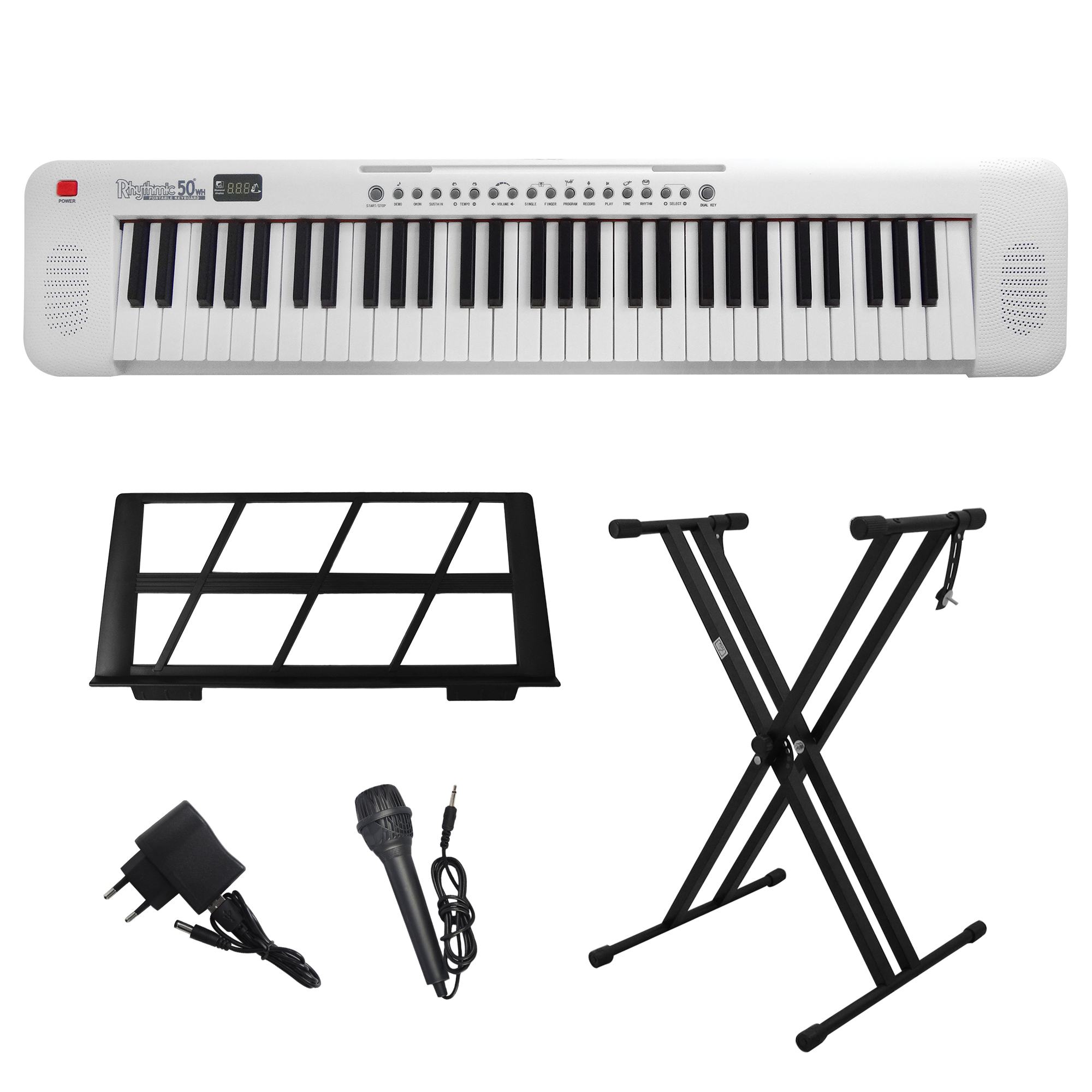 O teclado portátil Rhythmic50 é um instrumento musical versátil com 61 teclas de tamanho confortável (12 x 2 cm) distribuídas em 5 oitavas. Com display LED para fácil visualização, oferece uma biblioteca impressionante de 200 ritmos e 200 timbres diferentes, além de 60 músicas de demonstração para auxiliar no aprendizado. Possui funções essenciais como sustain, dual voice, e um prático sistema de lição integrado. Inclui recursos de gravação e reprodução para acompanhar seu progresso musical. Com entradas para microfone e saída de áudio, permite diversas possibilidades de uso. Suas dimensões compactas facilitam o transporte. Funciona com fonte 5V ou 4 pilhas AA, oferecendo flexibilidade de uso em diferentes ambientes. O pacote inclui o teclado em cor branca, ideal para estudantes e músicos iniciantes que buscam um instrumento completo para prática e desenvolvimento musical. Acompanha suporte em X para Teclado New York X2.
